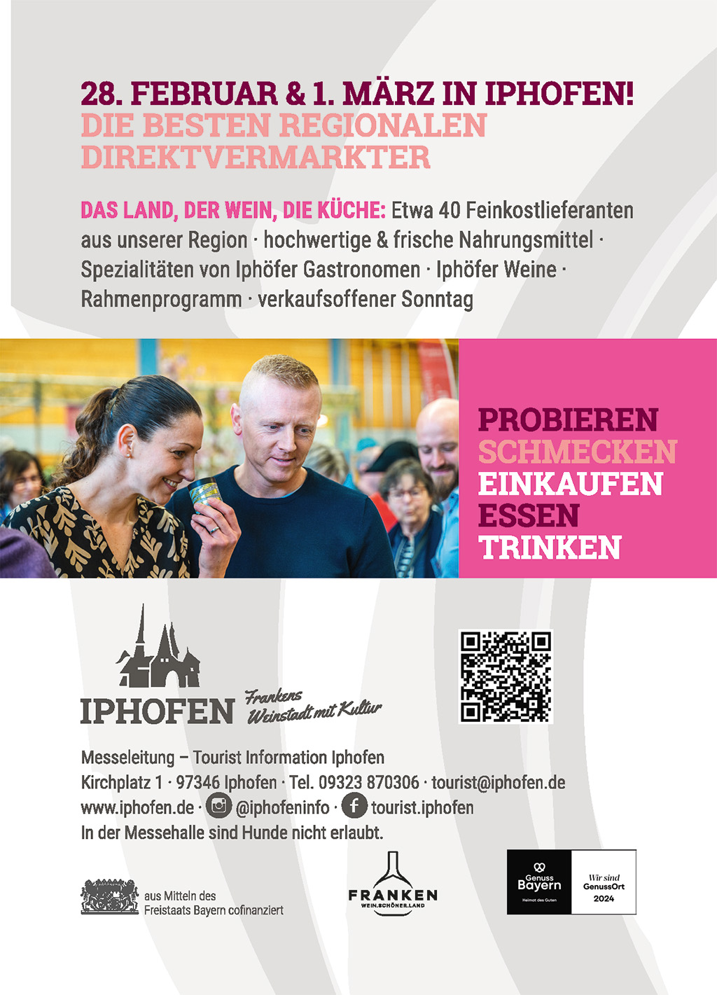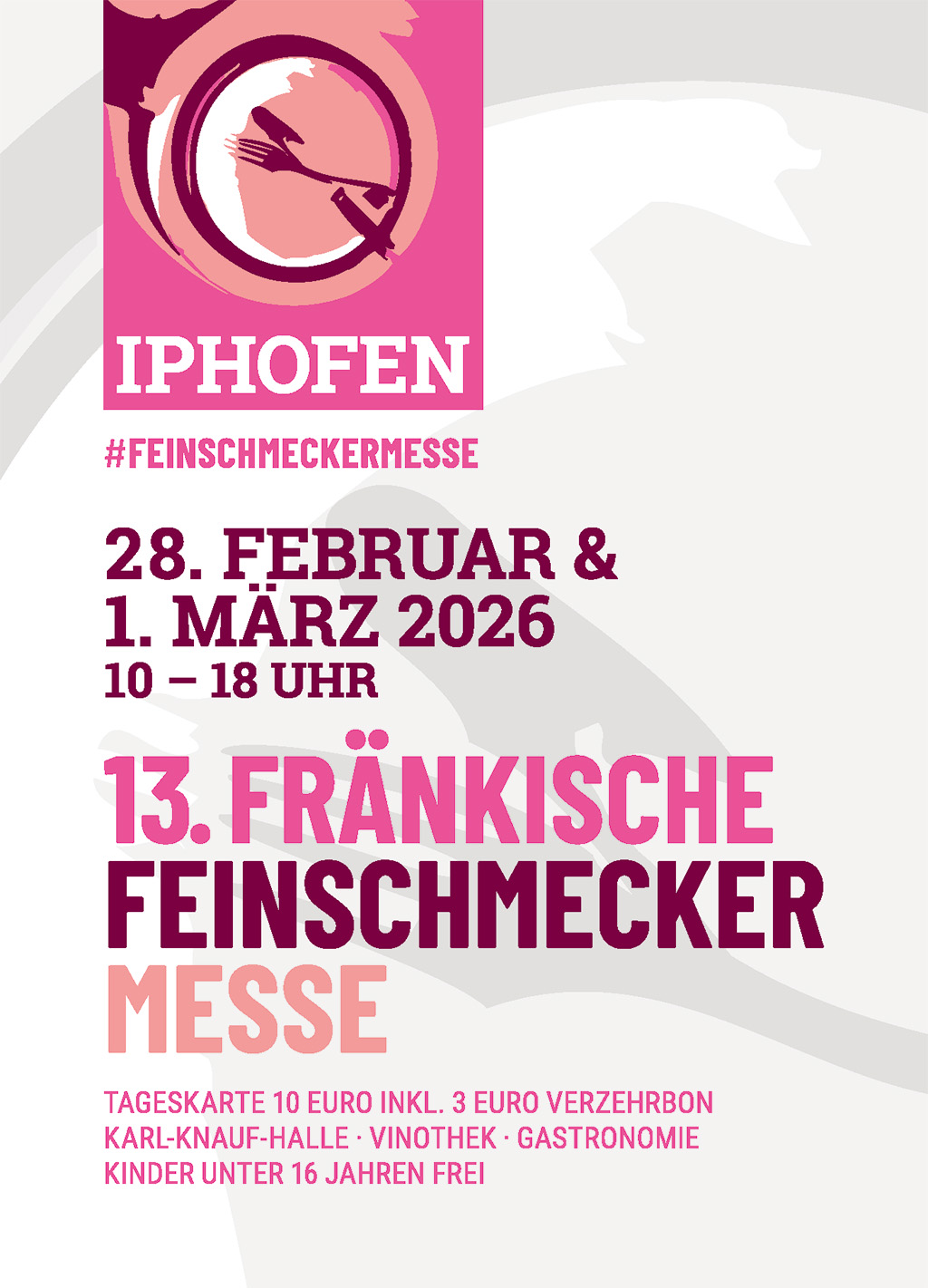 Wir freuen uns schon über euren Besuch anlässlich der 13. Fränkischen Feinschmeckermesse am 28.2. - 1.3.2026 in Iphofen. Wie wär´s, nach einem ausgiebigem Messebummel in der Karl-Knauf-Halle, einzukehren in unserer Vinothek zu fränkischem Weingenuss.